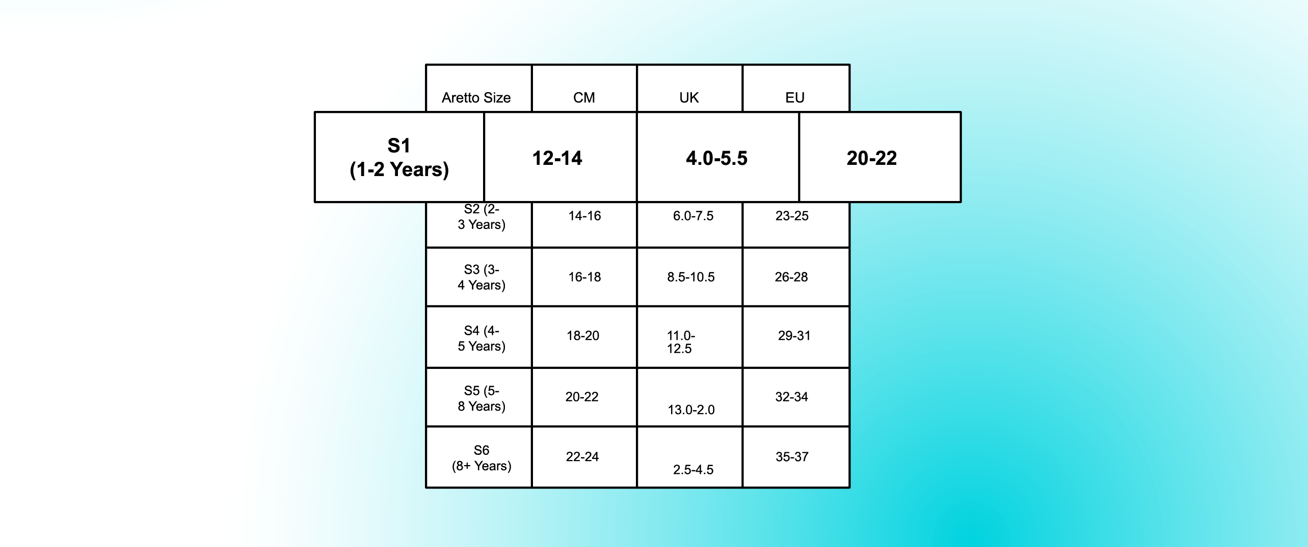 | Aretto | Age range | CM - Heel Toe | EU | UK |