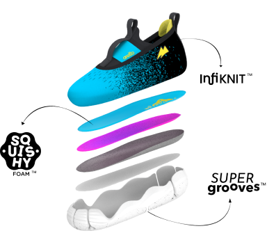 SUPER GROOVES TM is an ingenious, intuitive technology that adapts to millimetric growth of the feet resulting in a shoe size expansion that is organic and unique to the wearer alone. They are grooves built into the sole that bloom open to fit the natural shape of growing feet. Moreover, SuperGroovesTM keeps the sole at an optimum thickness of 4mm ensuring just the right amount of padding while helping feet feel the ground & thereby promote sensory development.